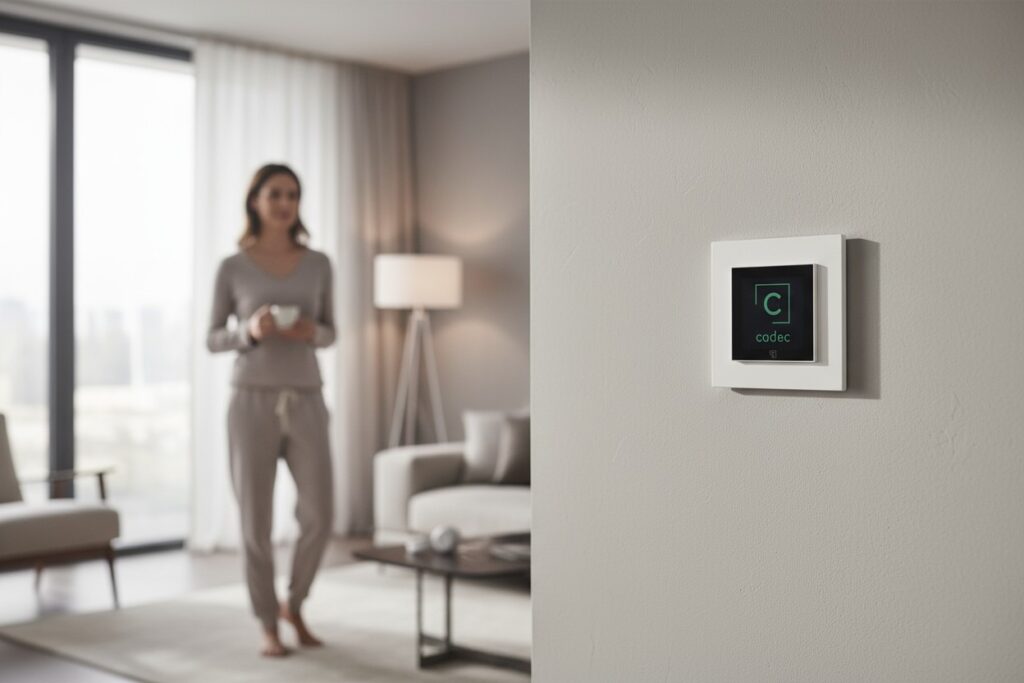 An der Wand: ein Smart-Thermostat mit dem Logo des Hauses. Unsichtbar und doch alles, was zählt.